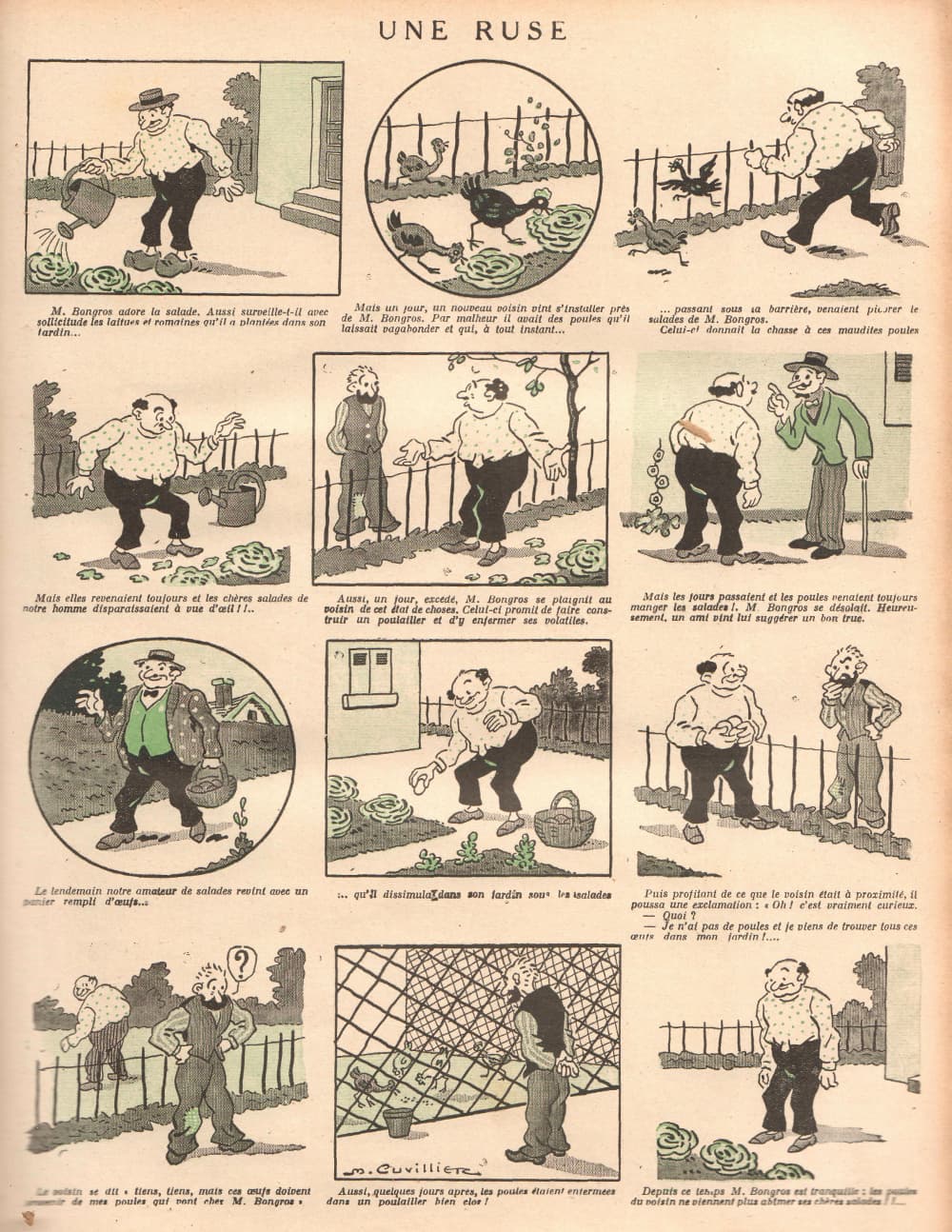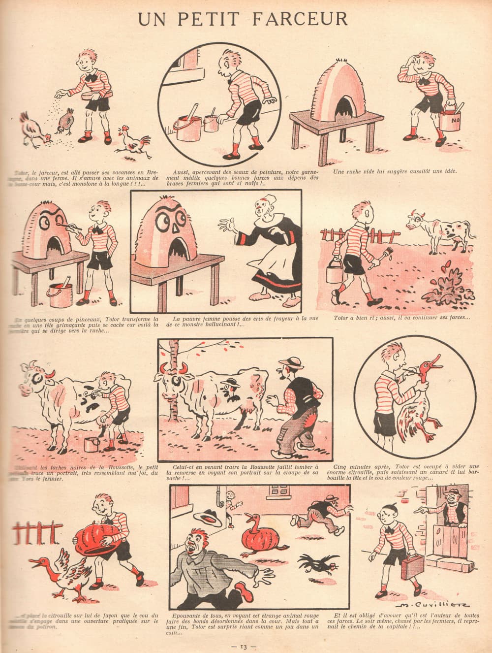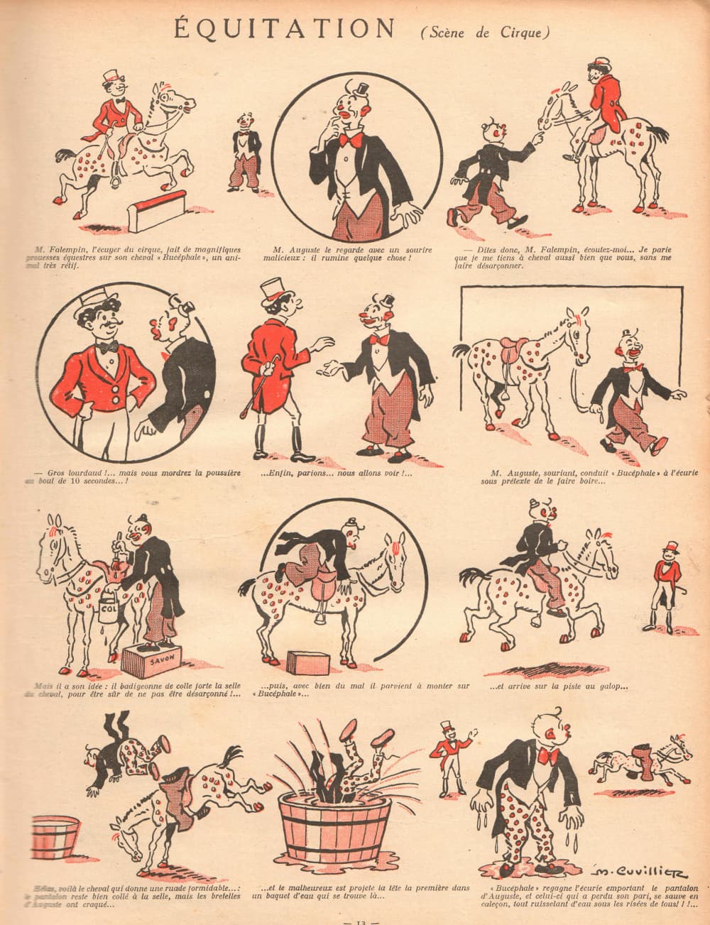 Cuvillier a réalisé 16 grandes histoires sur une grande page et 2 dessins uniques. Cela nous permet d’avoir ses réalisations lorsqu’il avait 30 ans. Certains thèmes ont été repris par la suite dans d’autres revues (par exemple : « Equitation, scène de cirque » ou « Une aventure au pole » ou « Jacquot veut être boxeur »).