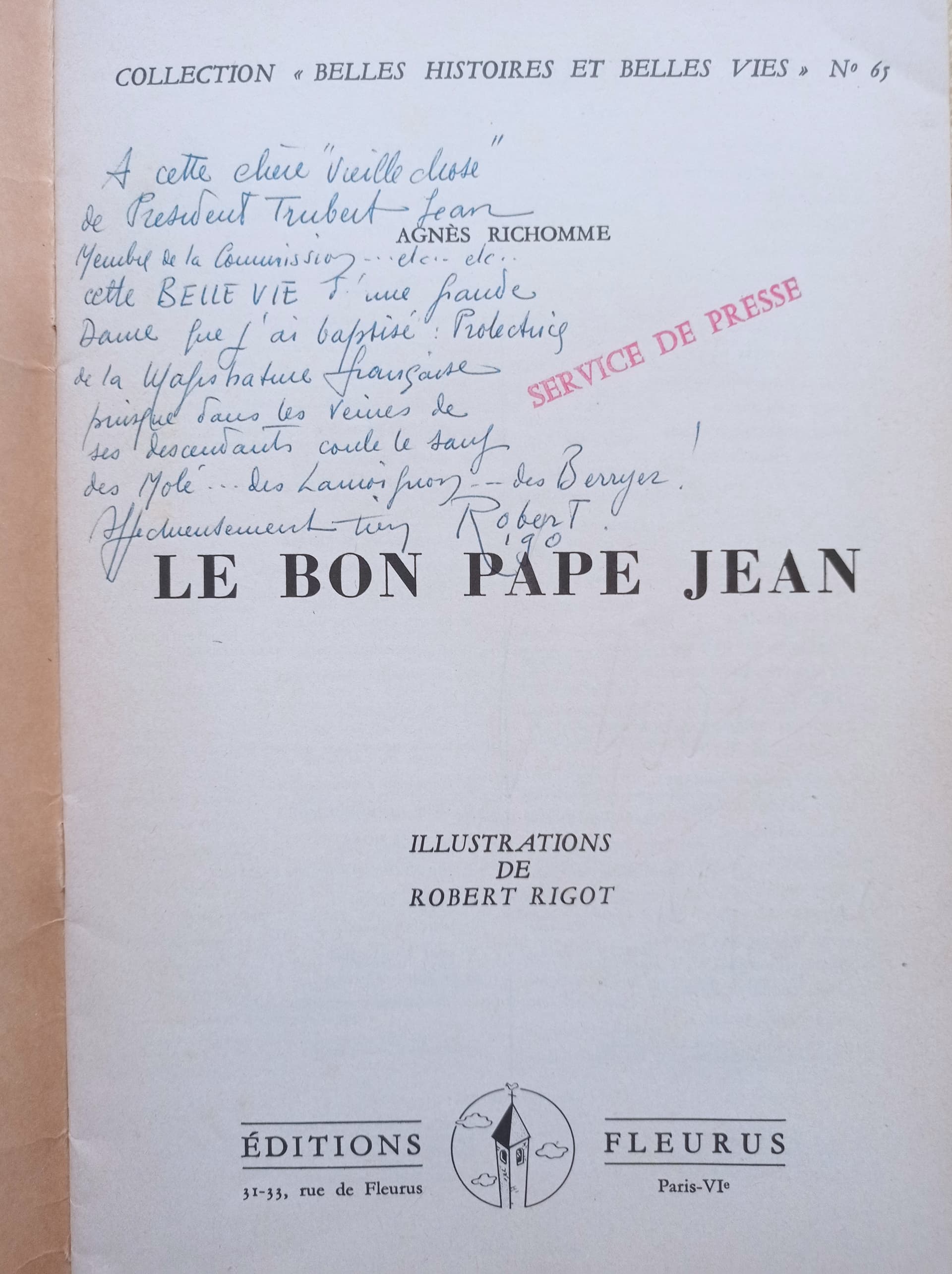 Une rare dédicace manuscrite de Robert Rigot adressée à Jean Trubert sur l’album « Belles Histoires et Belles Vies » numéro 65 « Le bon Pape Jean ».